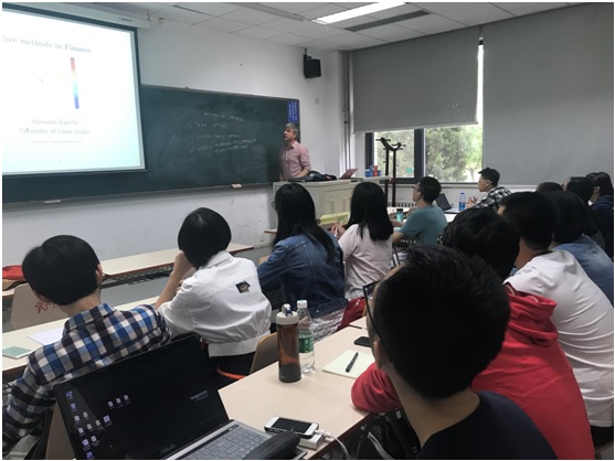 2017年5月4日下午2:00—4:00,5月9日下午4:00—6:00,5月11日下午2:00—4:00,意大利乌迪内大学经济与统计学院教授,法国国家信息与自动化研究院(INRIA)创办的金融衍生品定价与风险管理平台PREMIA的学术主管Antonino Zanette教授来我校沙河校区对我校师生进行了关于“Hybrid TREE methods in Finance and Insurance”的三次短期课程培训。此次短期课程是我校重要活动之一,也是Antonino教授受邀来中国精算研究院进行学术交流的重要环节。在为期三天的课程中,Antonino教授介绍了金融衍生品定价中的树方法(Tree Method)、蒙特卡洛模拟方法(Monte Carlo Method0)以及一些混合树方法(Hybrid Tree Method),在介绍完各种方法以后,Antonino教授以具有最低终生提取利益保证变额年金(GLWB)为例对混合树方法进行了应用讲解。我院韦晓老师和2016级研究生共20余人参与了此次短期课程。