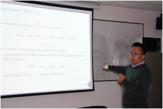 2016年11月29日,中国精算研究院精算论坛讲座邀请到了澳大利亚悉尼科技大学金融学院的肖亚军教授,为我们介绍了金融中介在资产定价中的作用。肖教授通过简单直观的例子为我们介绍了问题提出的背景以及解决的方式,通过理论推导给出了含有金融中介的资产定价公式,并利用中国市场的实际数据验证了此公式在解释中国市场融资融券异象中的有效性。