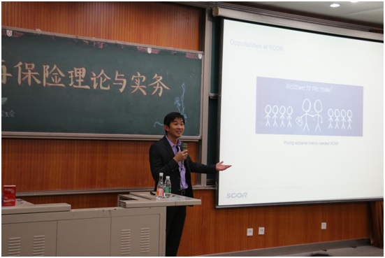 随后,贾女士又通过保险生态系统引出保险价值链,从销售、产品、客服等多个角度分析了再保险的工作内容与工作价值。她指出:“再保险是个多赢的价值命题”,在内部专业性、创新性、多赢性与外部庞大市场的双重驱动下,SCOR在中国的发展前景不可限量。贾女士还鼓励保险学子尝试到SCOR实习,在实践中不断锻炼自己、提升自我。