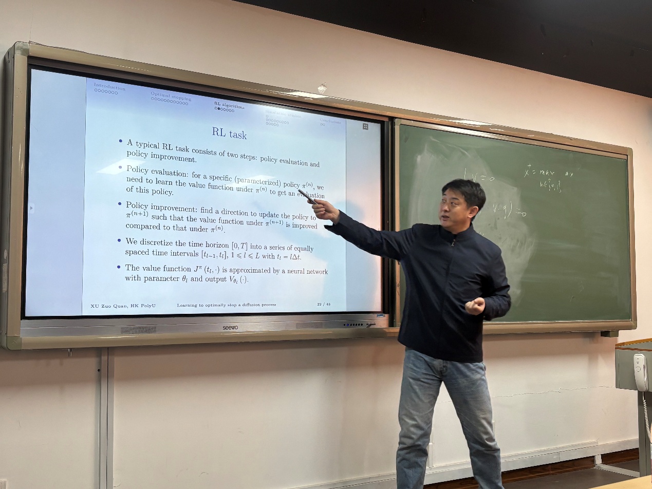 在讲座中,许左权教授聚焦于模型参数未知情形下的扩散过程最优停止问题,将其置于Wang等人(2020)提出的连续时间强化学习(RL)框架下进行研究。他通过引入变分不等式的惩罚项,将原问题转化为包含两类动作的随机最优控制问题;进一步地,通过将控制策略随机化为伯努利分布并加入熵正则项以促进探索,推导出半解析形式的最优伯努利分布。在此基础上,结合Jia与Zhou(2022a)建立的鞅方法,构建了高效的离线与在线强化学习算法。许教授还展示了该方法在有限期限美式看跌期权定价、含交易成本的Merton投资问题以及高维最优停止问题中的出色表现,验证了算法在价值函数学习与自由边界刻画方面的高精度与强可扩展性。