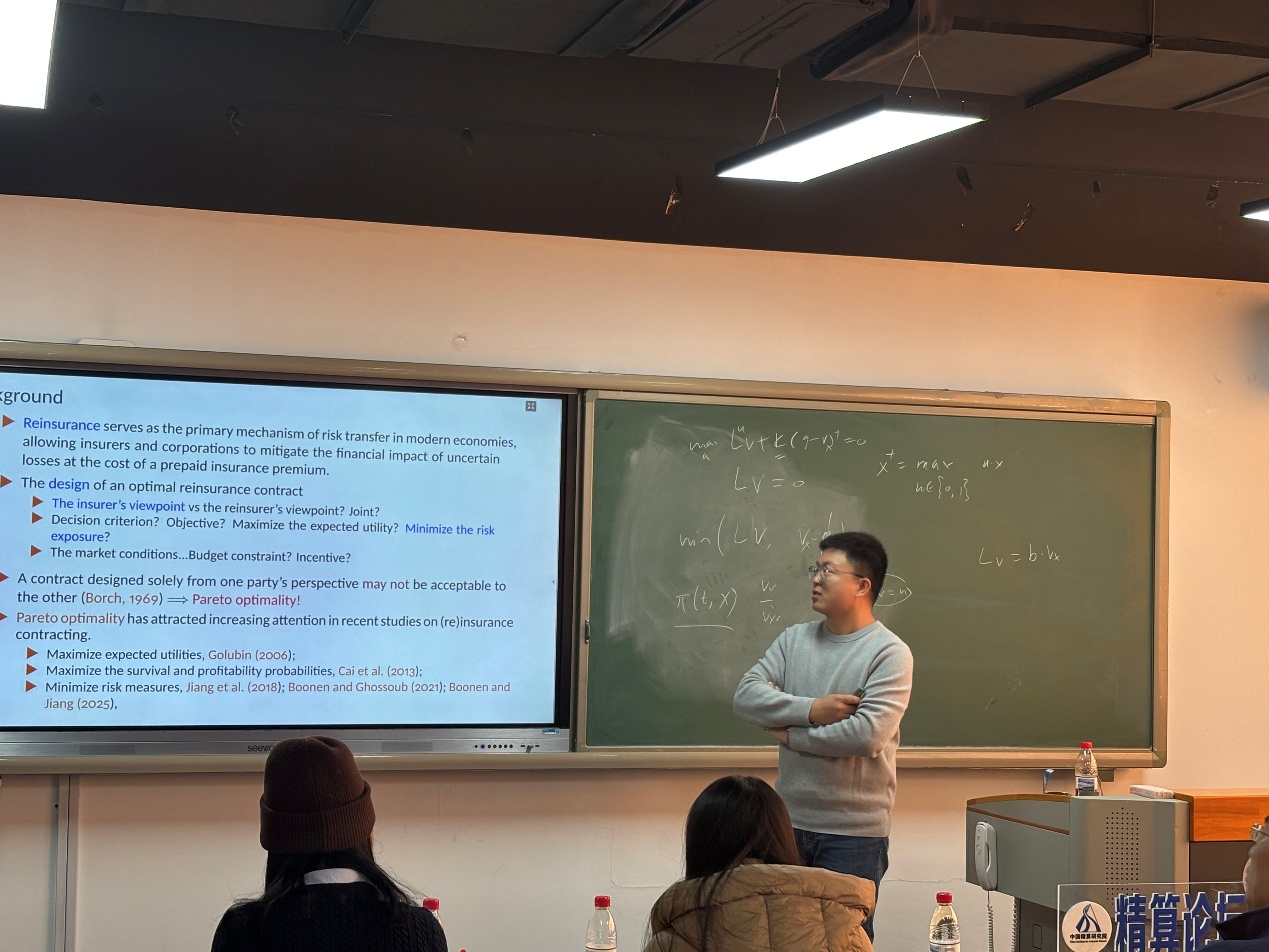 在第二场报告中,张艺赢老师从帕累托最优视角出发,探讨了当保险人与再保险人均采用扭曲风险度量进行再保险谈判时的最优合同设计问题。特别地,她考虑双方风险偏好仅部分已知的情形——即其扭曲函数受限于一系列彩票风险的置信区间信息及结构性约束(如凹性)。在一般保费原理下,张老师推导出最优再保险赔付函数的解析表达式,该表达式仅依赖于双方视角下的“最坏情形”扭曲函数。他进一步指出:当仅有个体特定偏好信息时,最坏情形扭曲函数呈阶梯状且由不确定性集合唯一确定;若引入额外通用信息,则扭曲函数变为分段线性,其参数可通过求解有限维约束优化问题获得。最后,他通过数值实例生动展示了理论结果的实际应用价值。