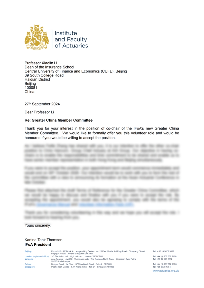 近日,英国精算师协会(IFOA)大中华区委员会成立,我院李晓林教授出任该委员会联席主席。