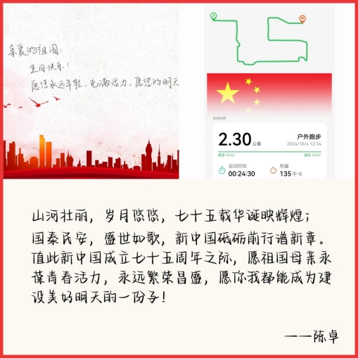 支部党员们通过创意运动轨迹、手书祝福、骑行打卡等多种形式,表达对共和国生日的祝福。他们用脚步丈量祖国大地,用运动轨迹绘就“75”字样,以这种特别的方式向祖国致敬。同时,他们还手书祝福语,用文字传递对祖国的热爱和对美好生活的向往。