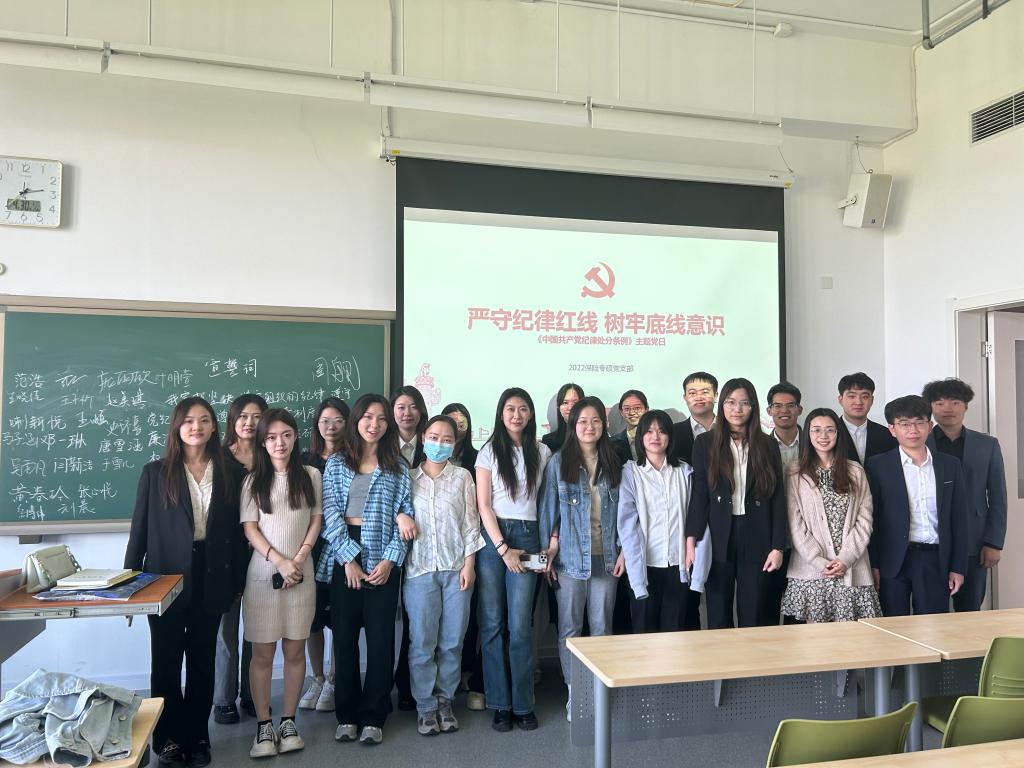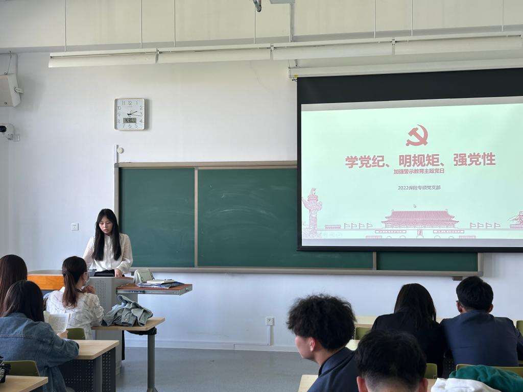 为推动党纪学习教育走深走实,进一步强化党员的纪律意识,4月30日下午,2022级保险专硕研究生党支部在主教309召开“严守纪律红线,树牢底线意识——学习《中国共产党纪律处分条例》”主题党日活动。2022级保险专硕党支部全体党员参加,活动由党支部书记尹秀洁主持。